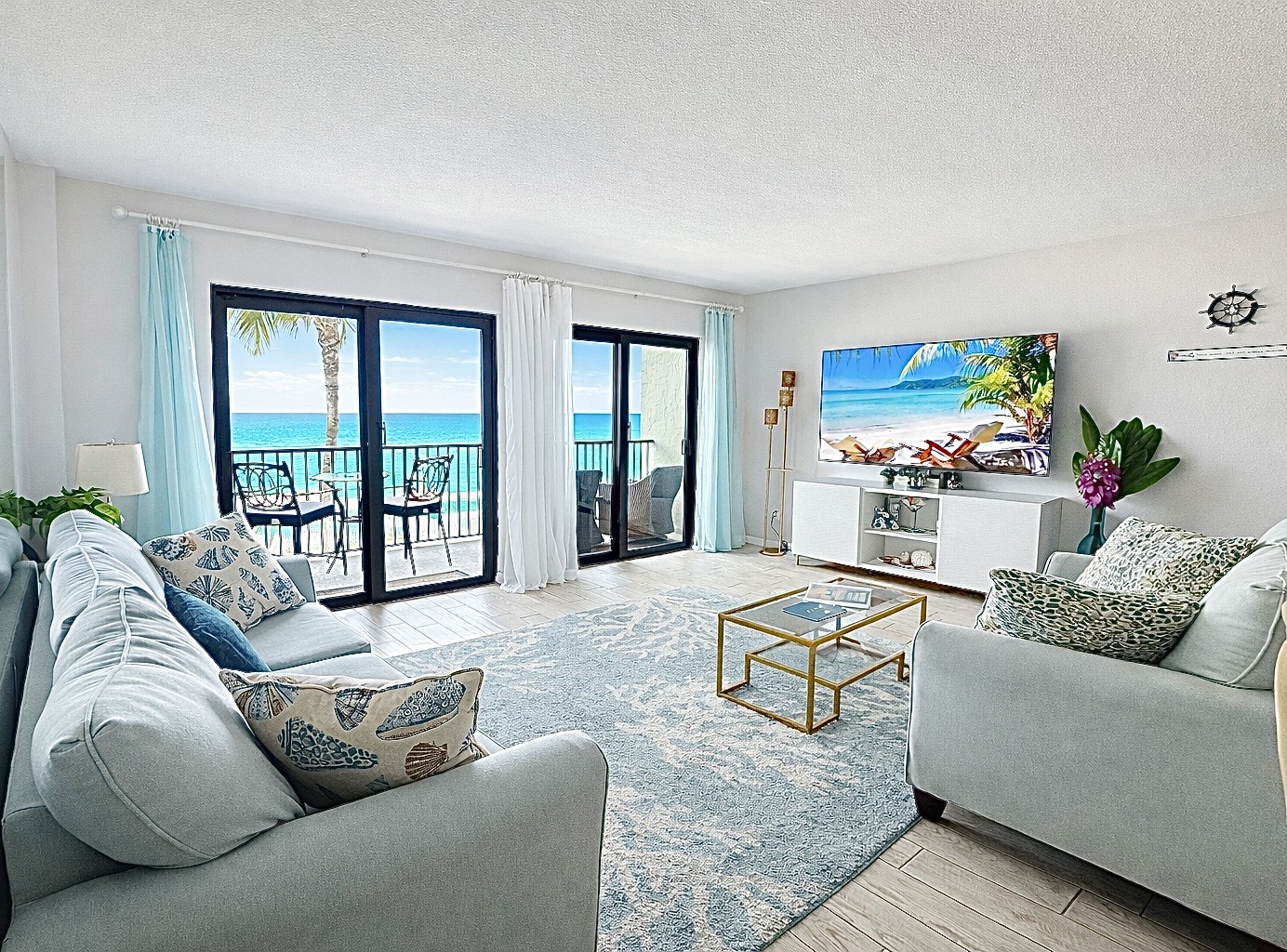 The open-concept living area features a 75” Smart TV and opens directly to a spacious private balcony where you can enjoy: